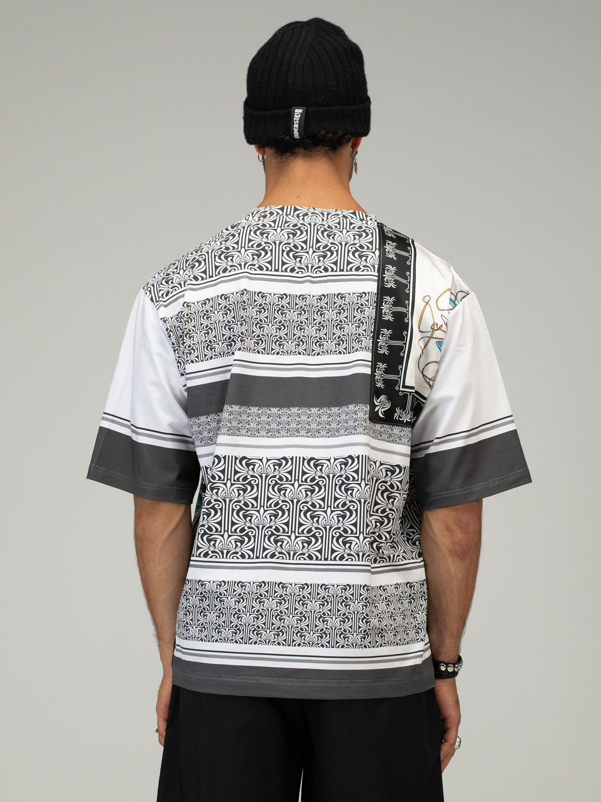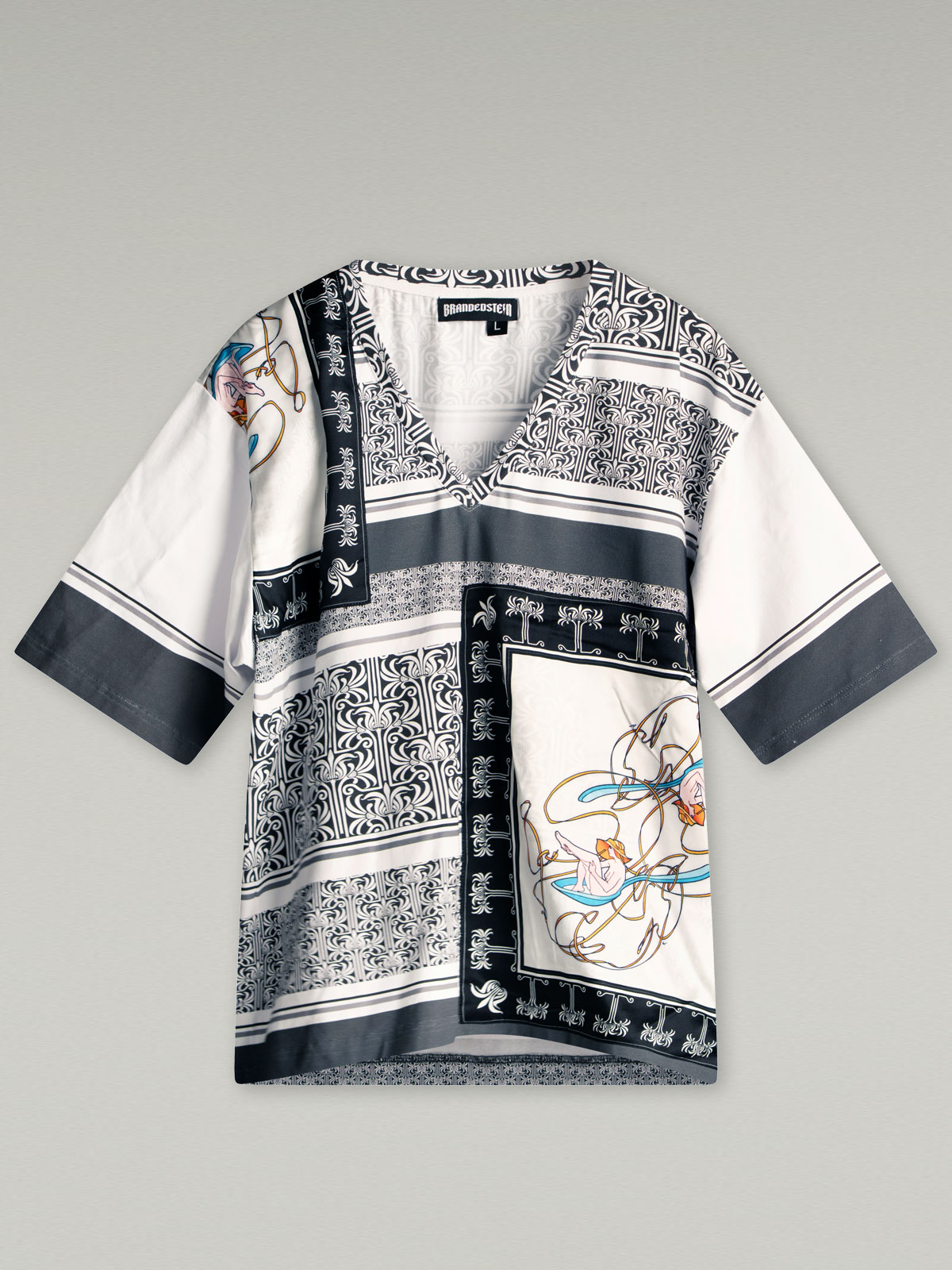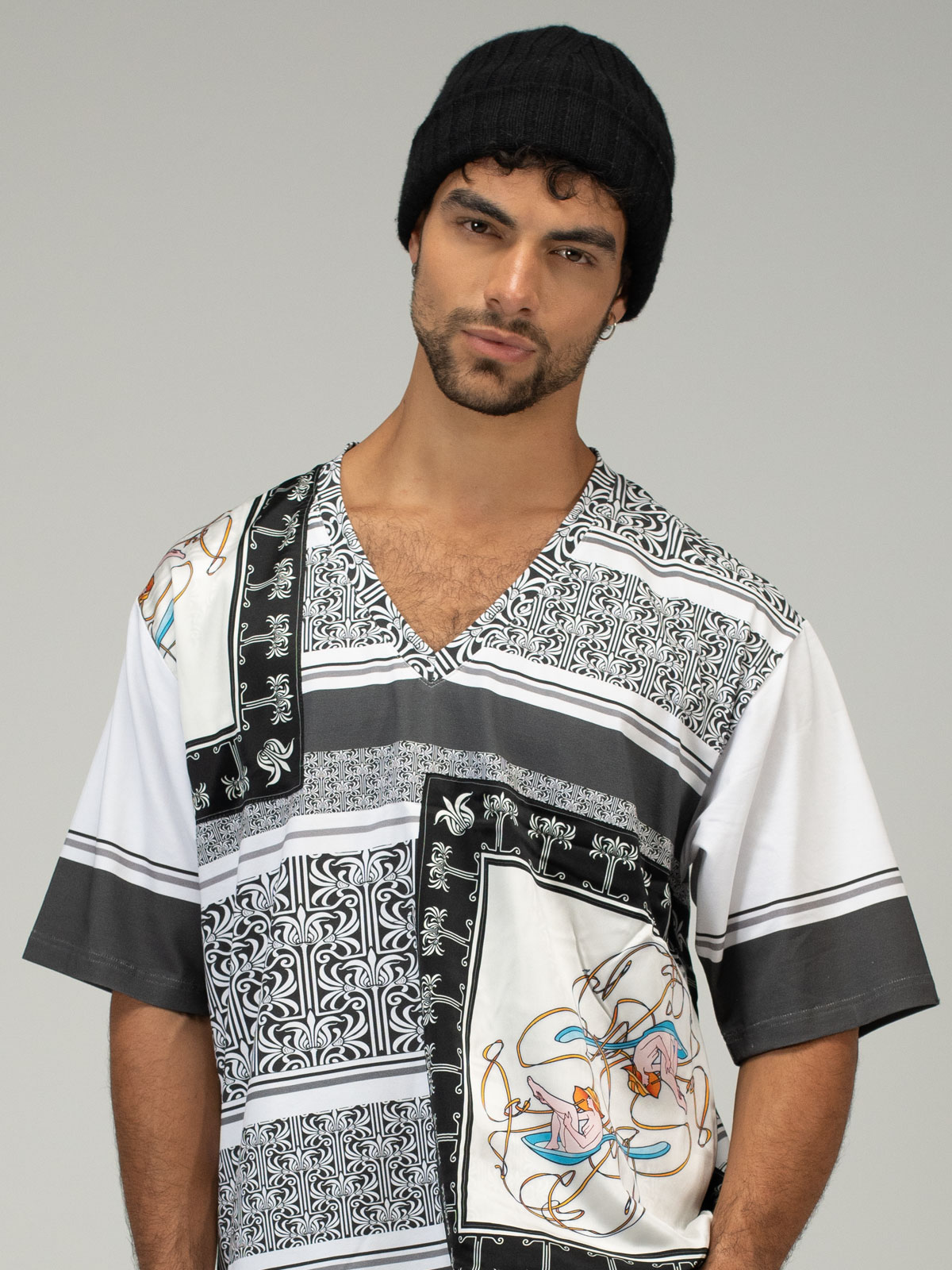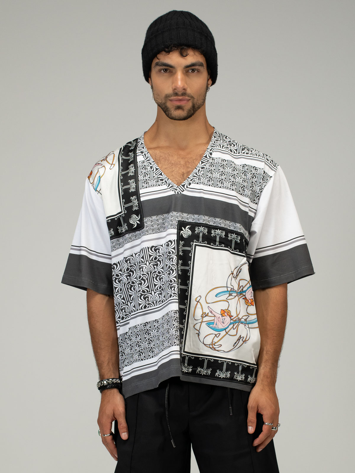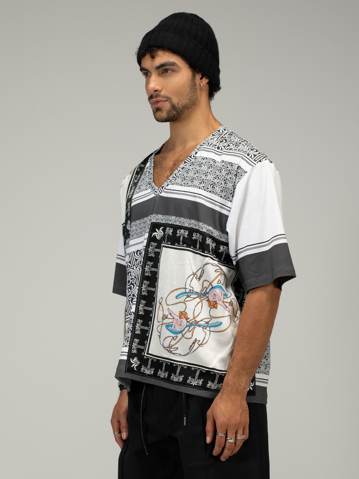This luxurious V-neck t-shirt redefines wearable art, crafted from the finest cotton jersey and elevated with four silk panels showcasing iconic rock ‘n’ roll artwork. Each panel tells a unique story, capturing moments of music history and cultural significance, printed with exquisite detail and carefully stitched into place for a seamless blend of artistry and craftsmanship. A celebration of rebellion, creativity, and timeless style, this design transforms a classic staple into a collector’s statement of sophistication.