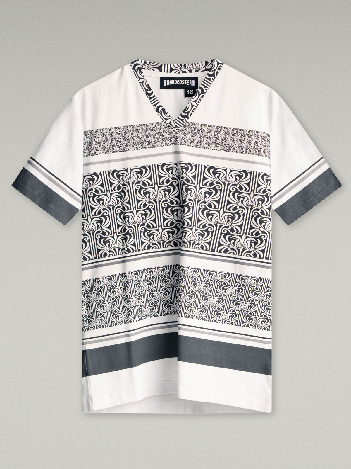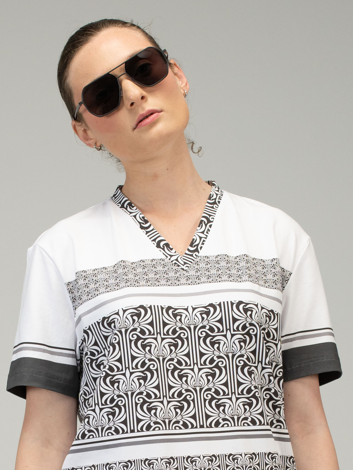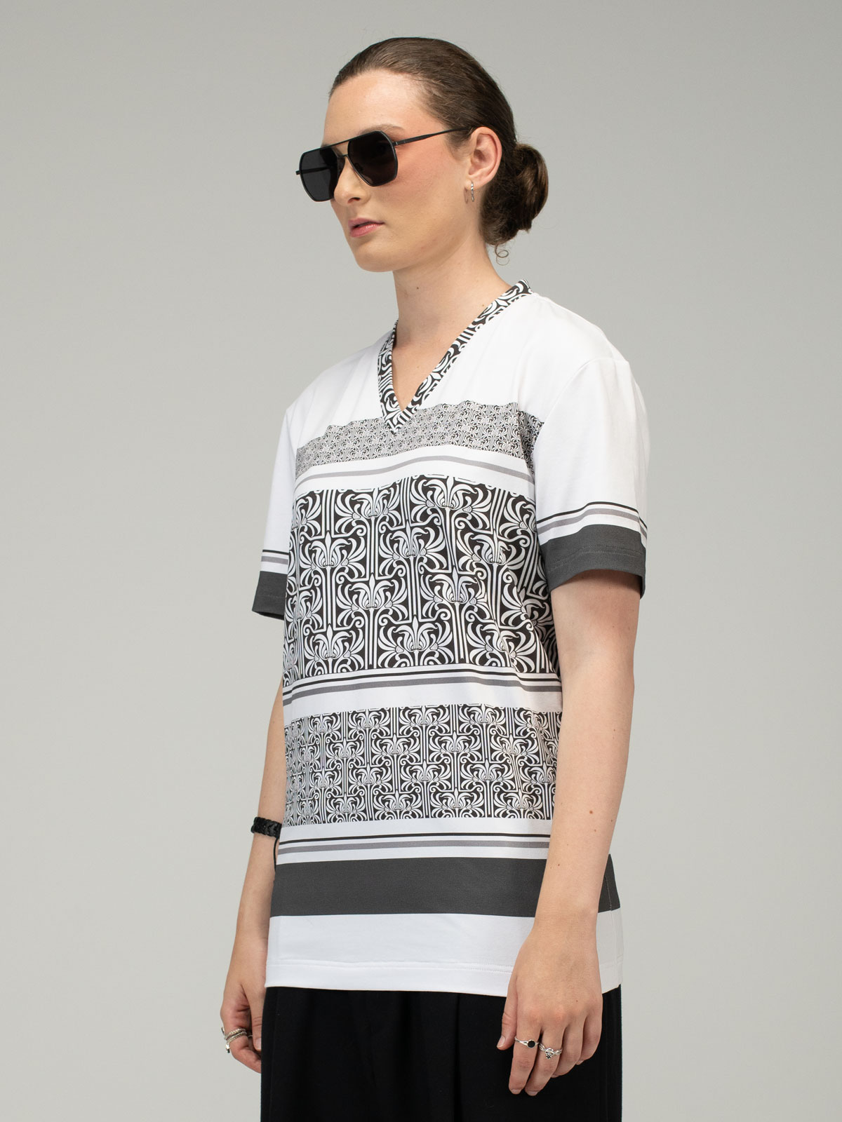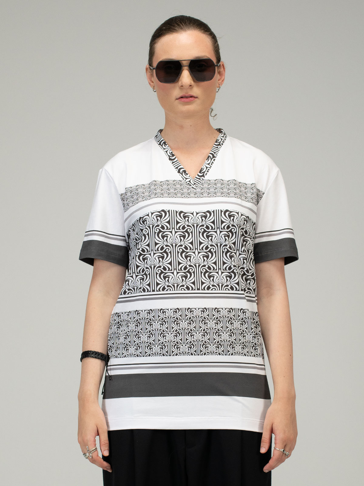 A regular fit V-neck that commands attention—crafted with vibrant full-fabric prints blending elegance and rock history. Featuring iconic patterns inspired by legendary album art, this tee fuses refined style with unmistakable rock ’n’ roll edge.