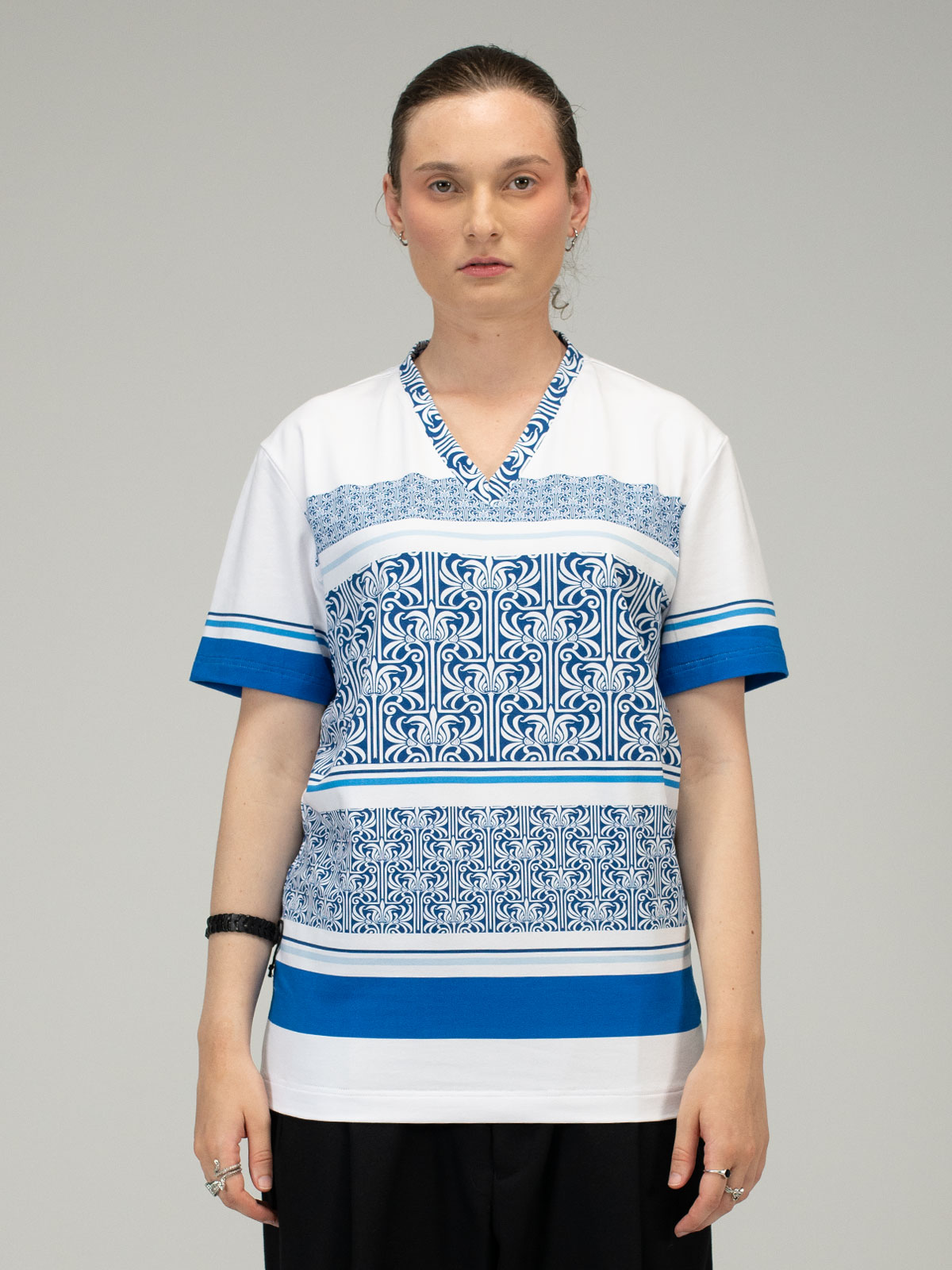 A regular fit V-neck that commands attention—crafted with vibrant full-fabric prints blending elegance and rock history. Featuring iconic patterns inspired by legendary album art, this tee fuses refined style with unmistakable rock ’n’ roll edge.
