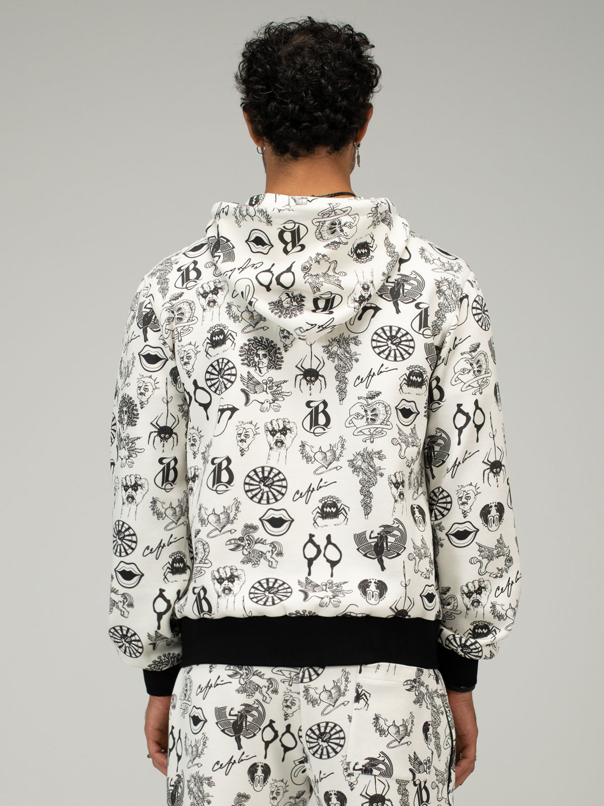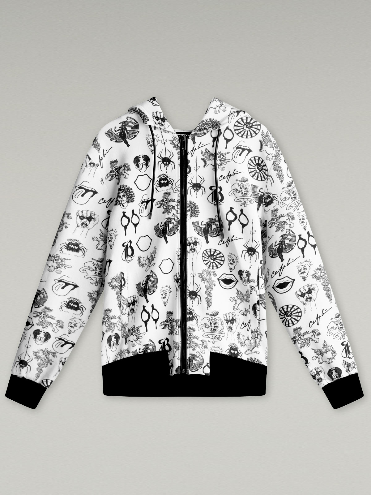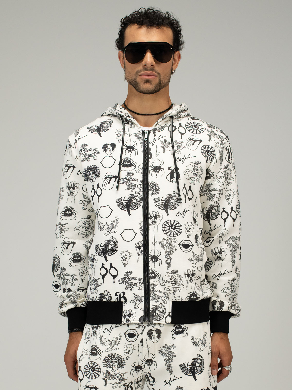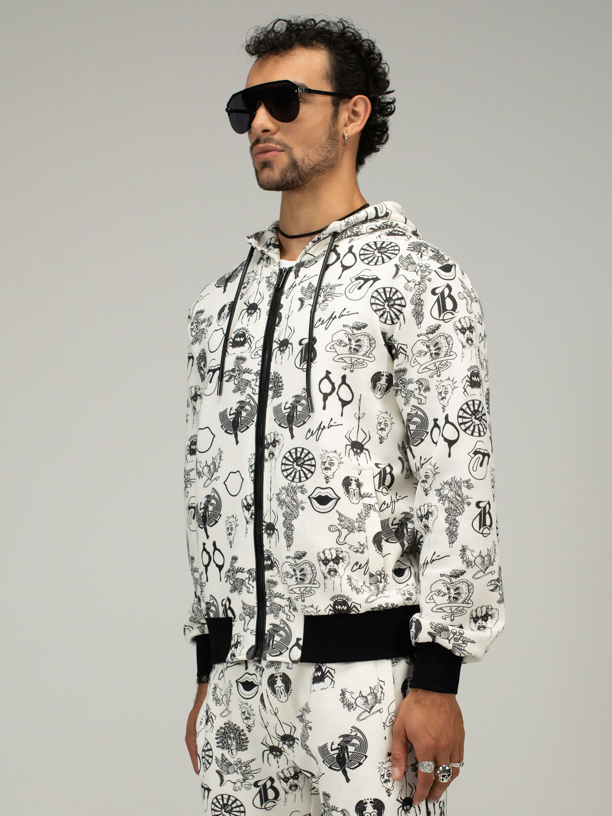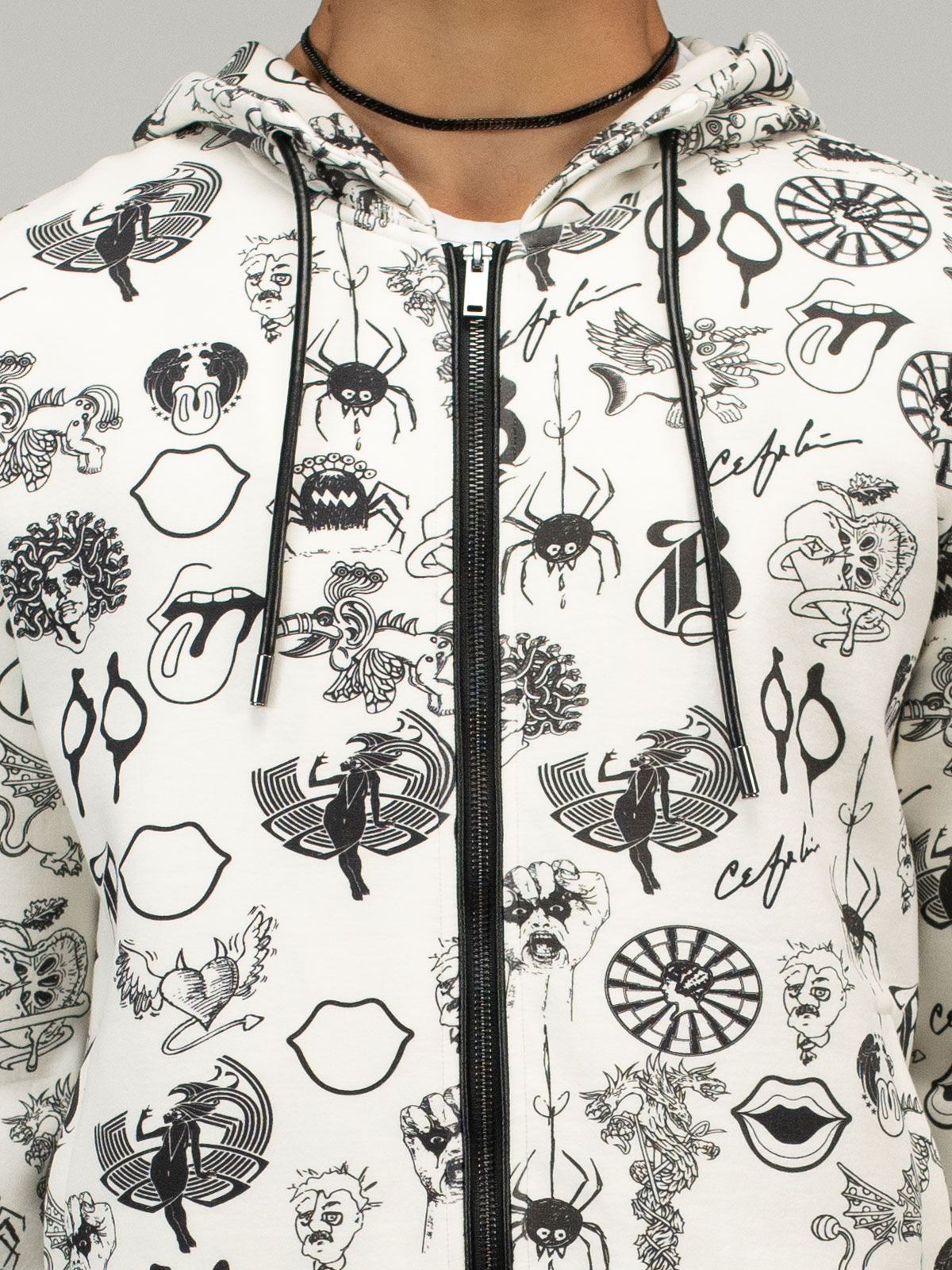 This zip-up hoodie blends comfort with elevated detail—crafted with soft, premium fabric and finished with luxury ribbing at the cuffs and waistband. Side pockets offer easy function, while leather piping along the zipper and a leather drawstring at the hood bring a sleek, rock-tinged edge to this everyday essential.