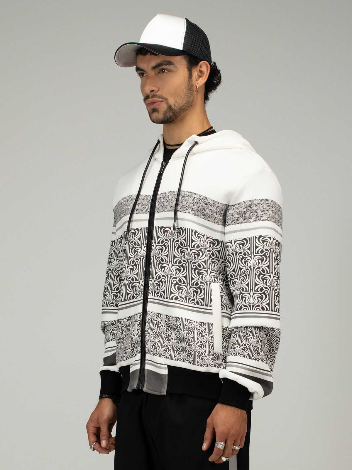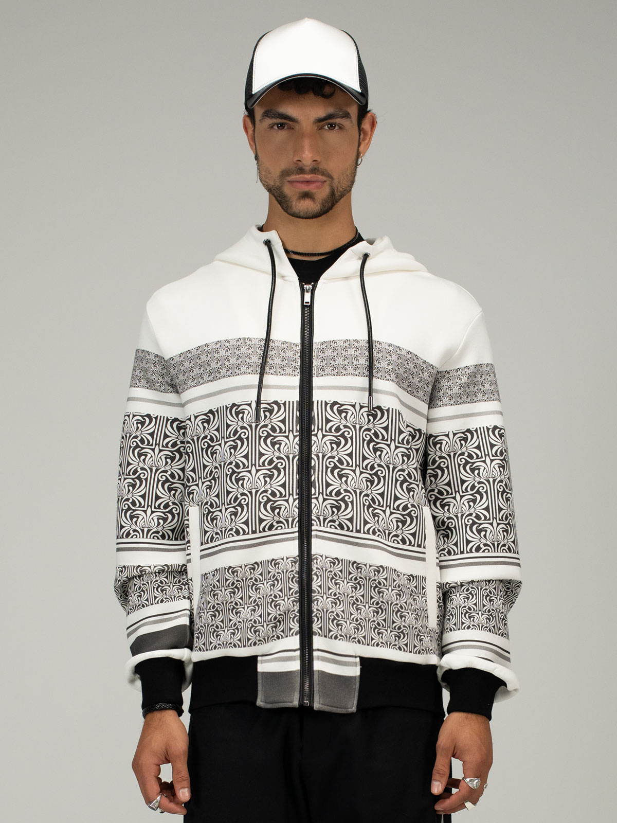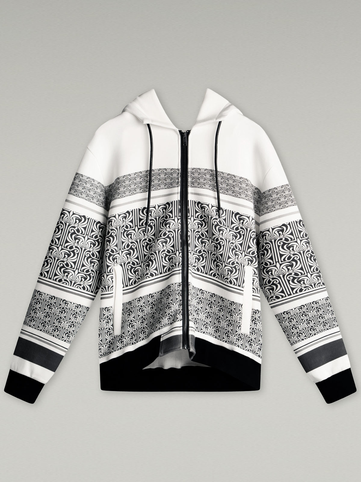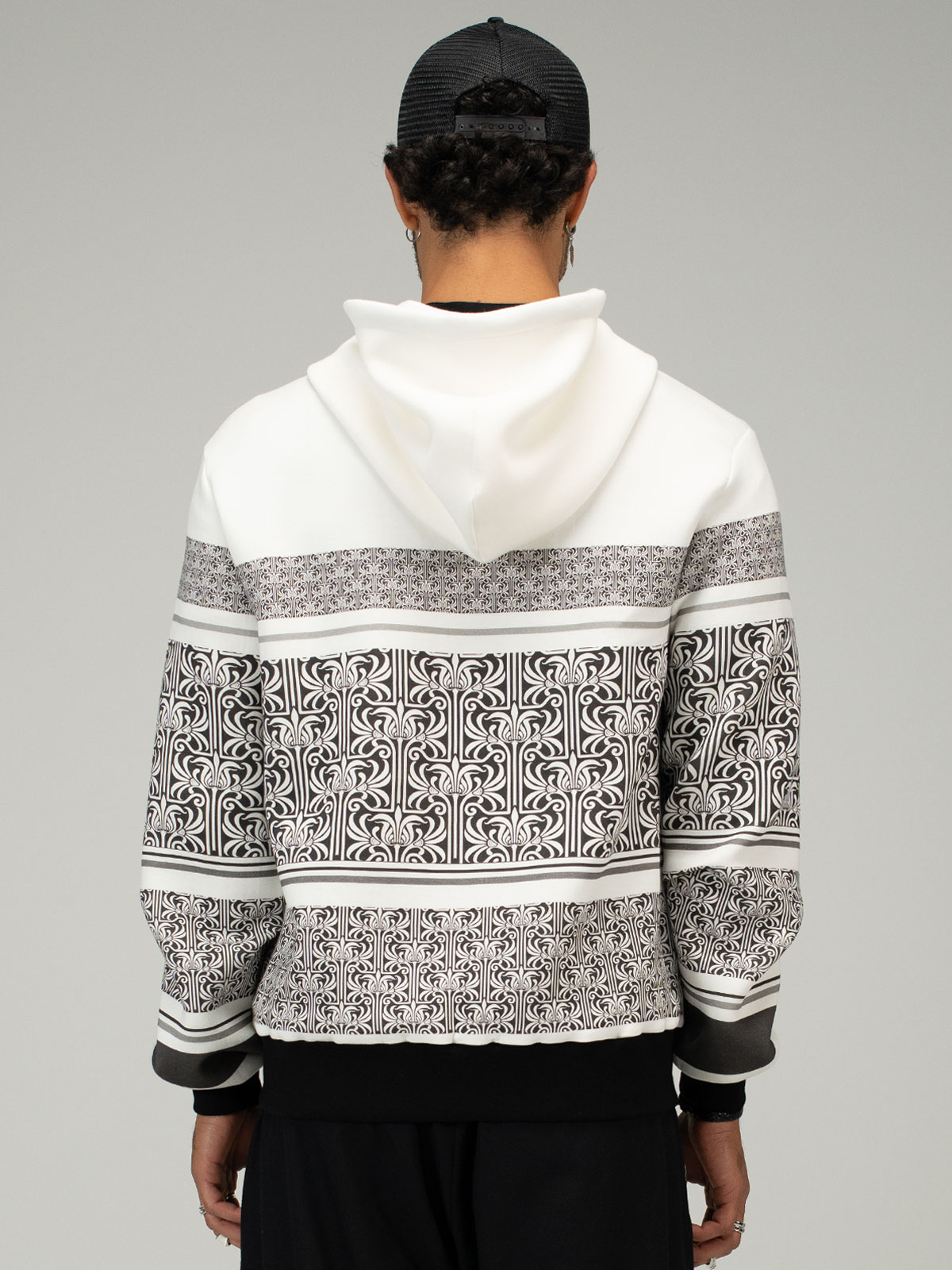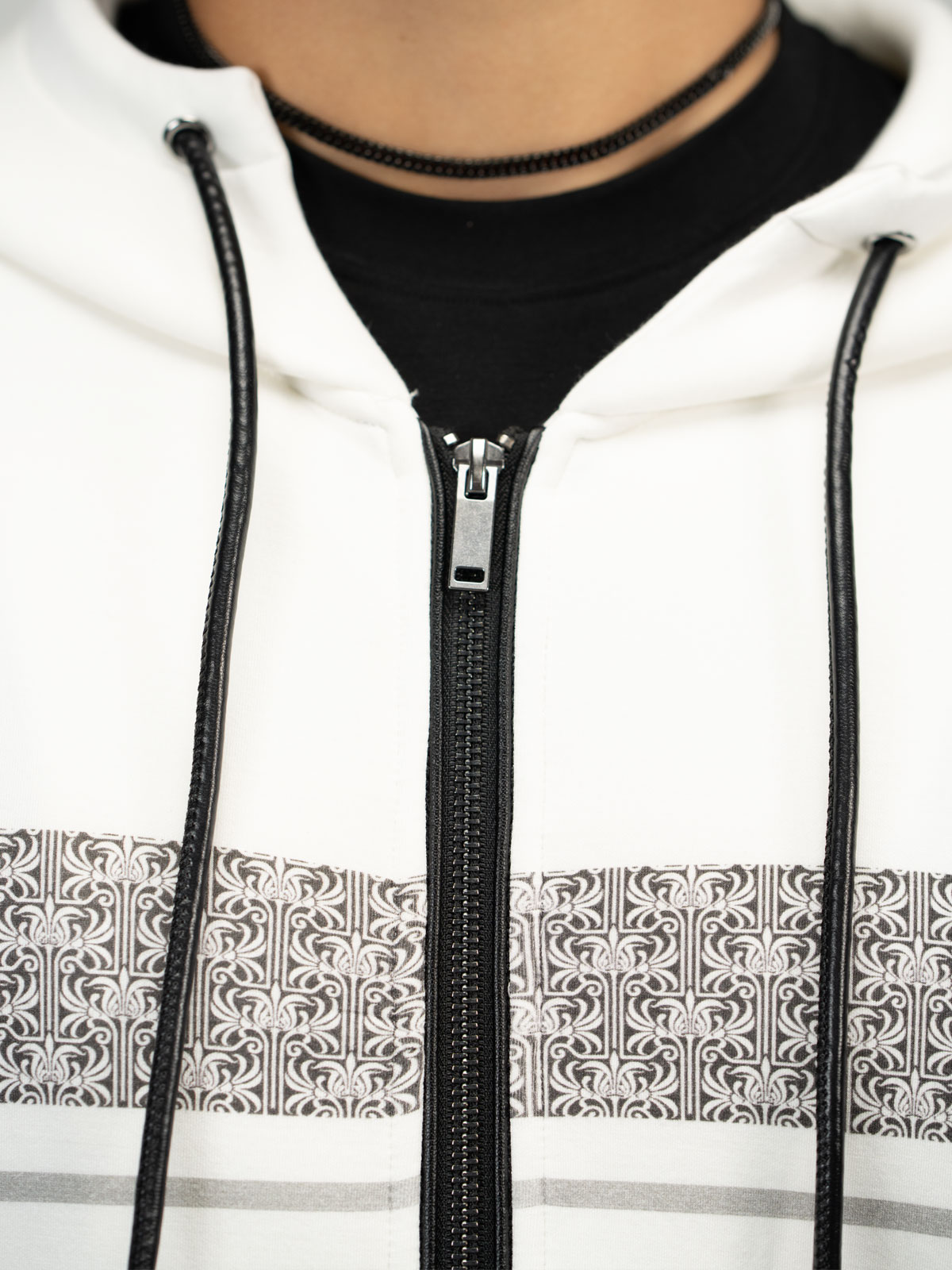 This zip-up hoodie blends comfort with elevated detail—crafted with soft, premium fabric and finished with luxury ribbing at the cuffs and waistband. Side pockets offer easy function, while leather piping along the zipper and a leather drawstring at the hood bring a sleek, rock-tinged edge to this everyday essential.