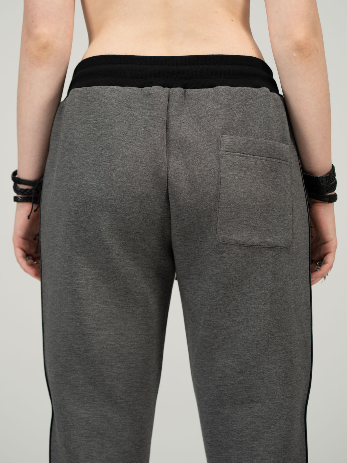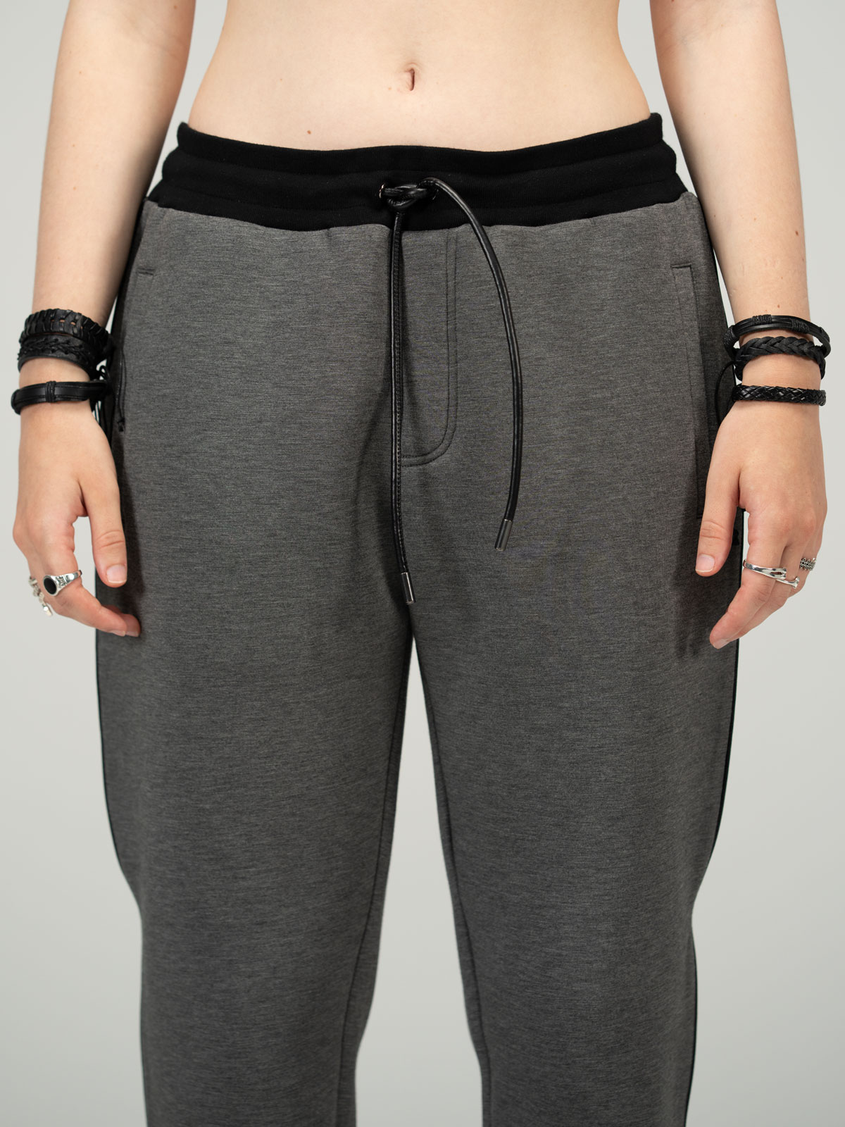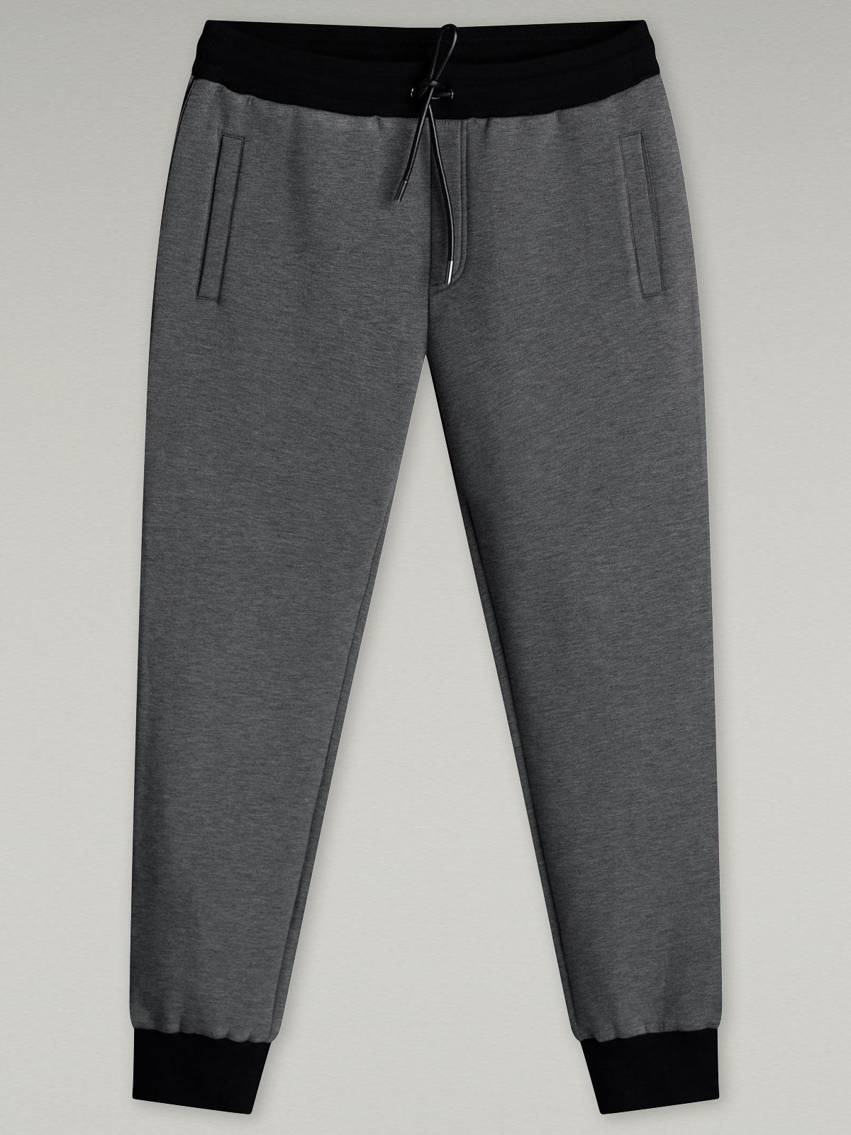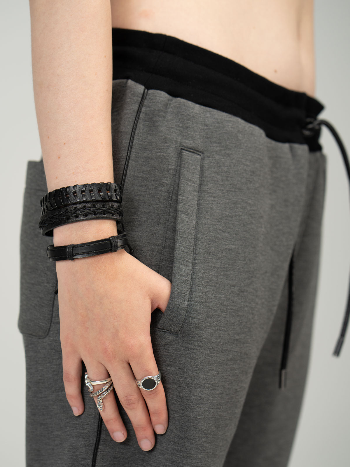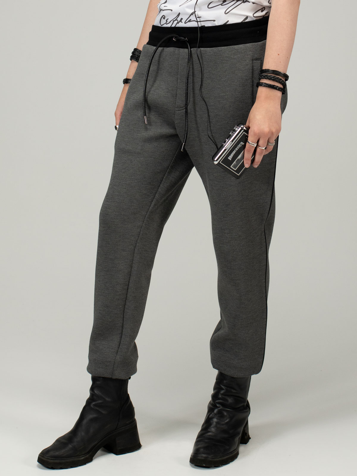 This jogger is crafted from ultra-comfortable leisure fabric and finished with luxury ribbing at the waistband and cuffs for a refined fit. The elastic waistband features a leather rope drawstring, while sleek side leather piping adds a subtle hit of rock-and-roll attitude. Effortless comfort with an edge.