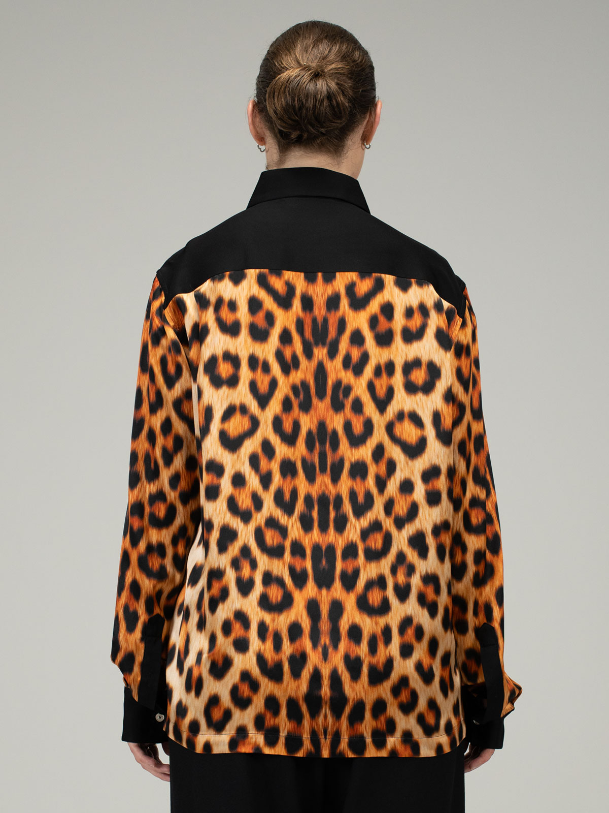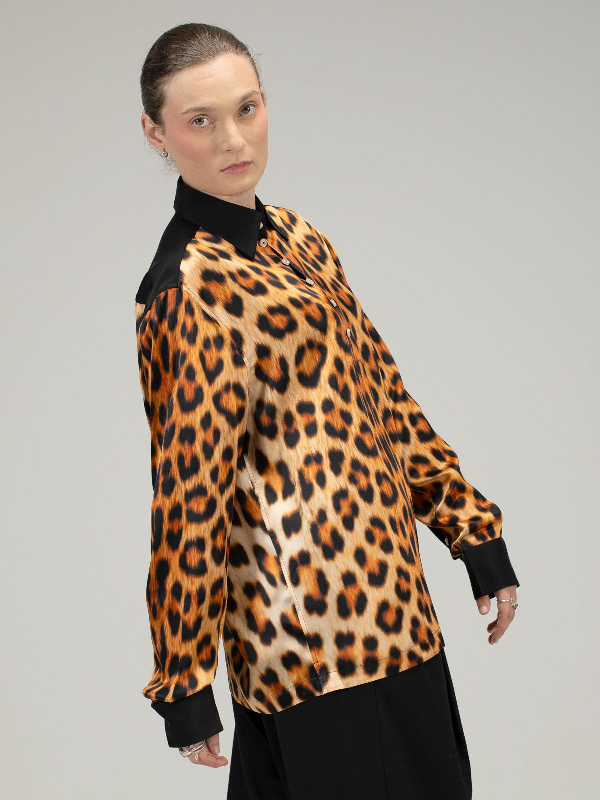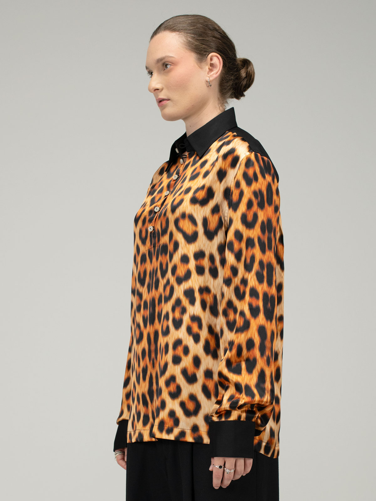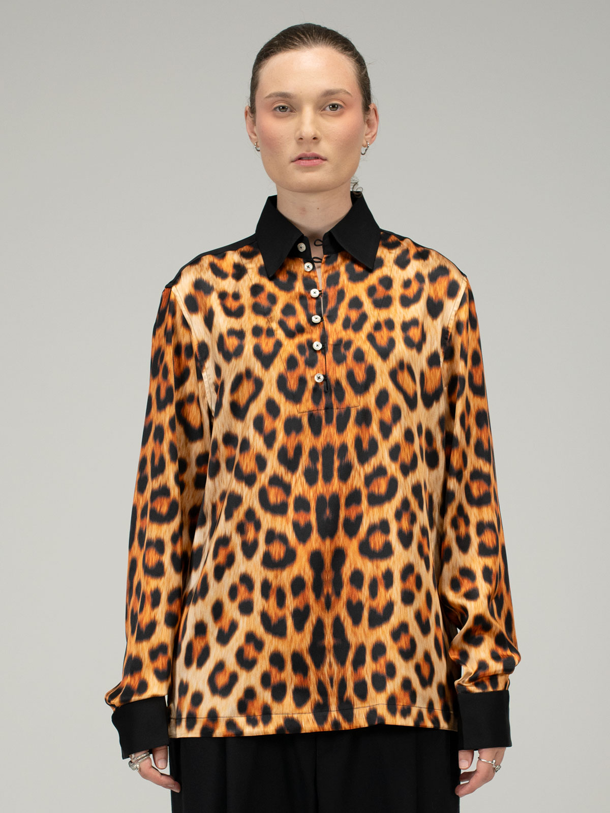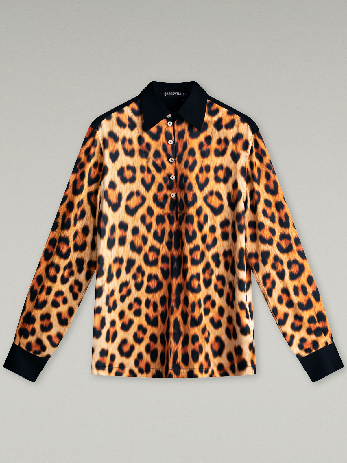 This pullover dress shirt is crafted from luxurious silk and features bold rock and roll-inspired fabric prints. Designed with a classic collar, cuffs, and a minimalist five-button placket, it effortlessly blends timeless elegance with rebellious flair.